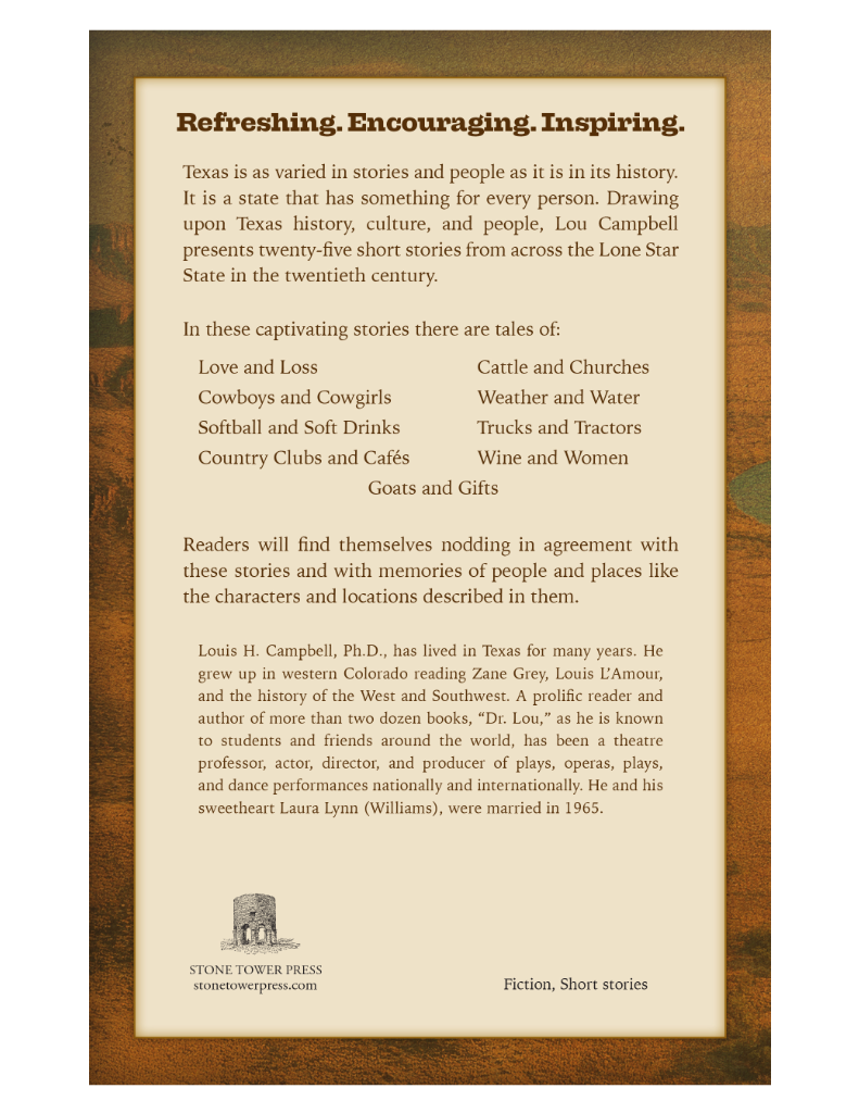 Louis H. Campbell, Ph.D., has lived in Texas for many years. He grew up in western Colorado reading Zane Grey, Louis L’Amour, and the history of the West and Southwest. A prolific reader and author of more than two dozen books, “Dr. Lou,” as he is known to students and friends around the world, has been a theatre professor, actor, director, and producer of plays, operas, plays, and dance performances nationally and internationally. He and his sweetheart Laura Lynn (Williams), were married in 1965.