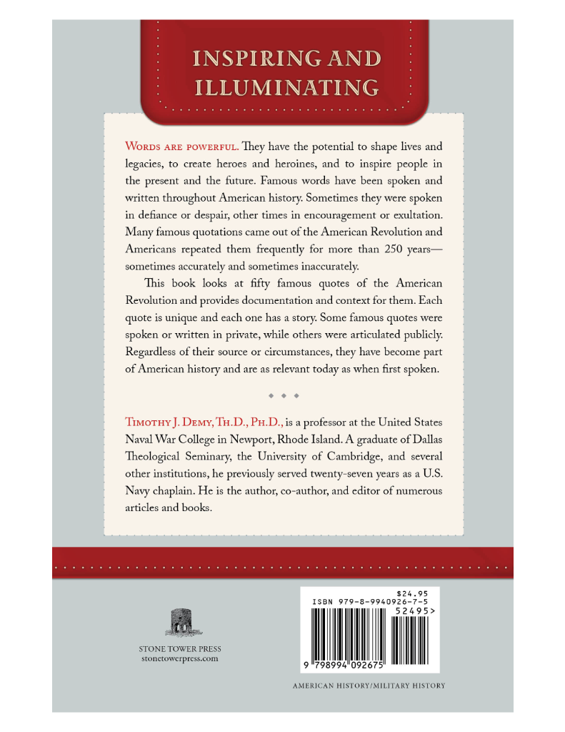Words are powerful. This book looks at fifty famous quotes of the American Revolution and provides documentation and context for them. Each quote is unique and each one has a story. Some famous quotes were spoken or written in private, while others were articulated publicly. Regardless of their source or circumstances, they have become part of American history and are as relevant today as when first spoken.